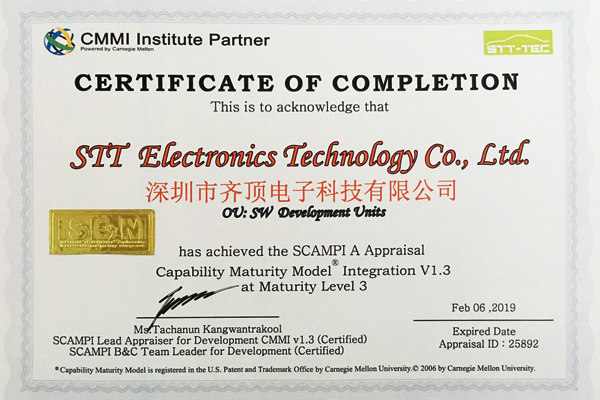 2016年1月份,在齊頂科技CMMI3級(jí)認(rèn)證結(jié)果發(fā)布會(huì)上,主任評(píng)估師宣布:深圳市齊頂電子科技有限公司已經(jīng)達(dá)成了CMMI3級(jí)目標(biāo),成功通過(guò)CMMI3級(jí)認(rèn)證。這是齊頂電子在軟件開(kāi)發(fā)和管理標(biāo)準(zhǔn)方面發(fā)展的里程碑,標(biāo)志著公司的軟件能力成熟度和項(xiàng)目管理水平與國(guó)際主流模式接軌。